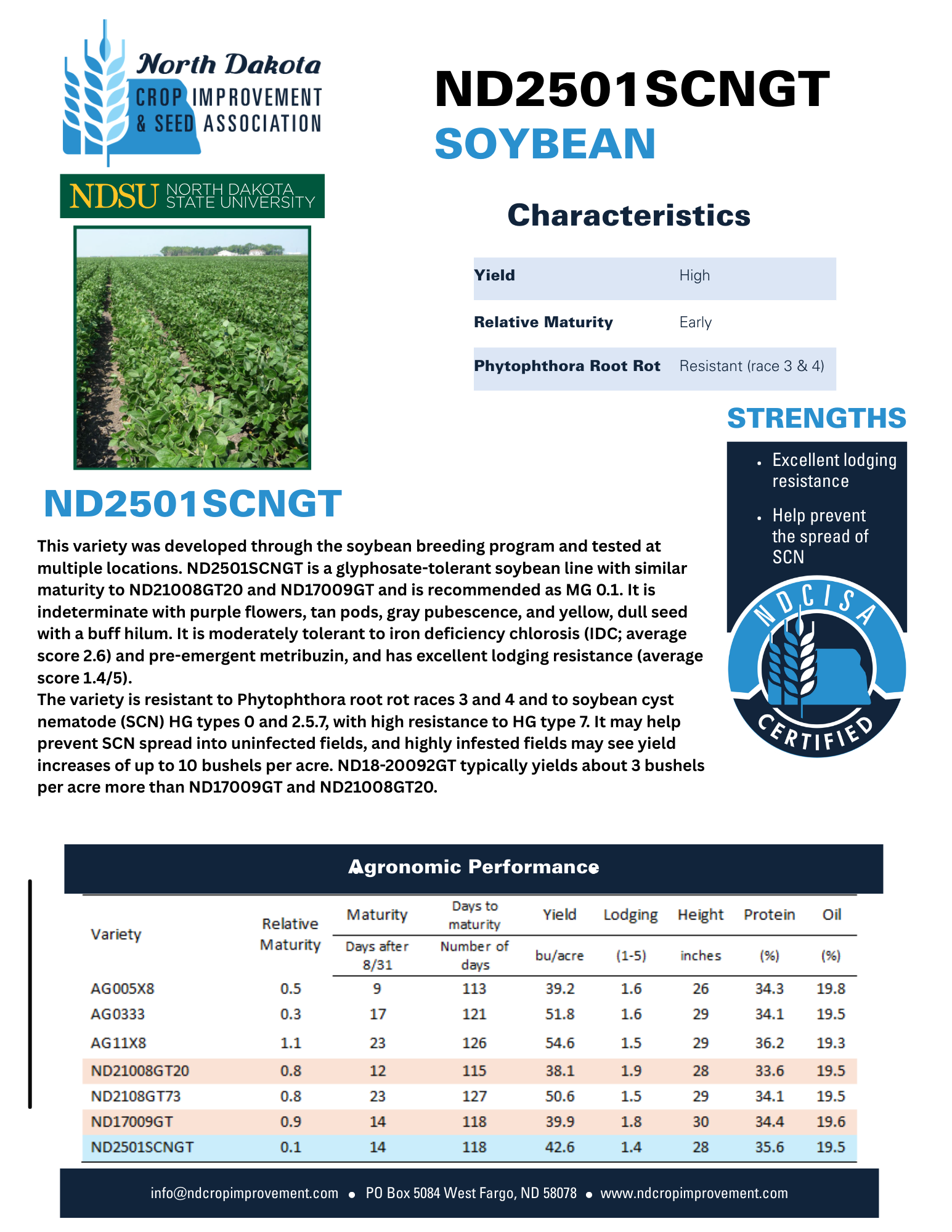 This variety was developed through the soybean breeding program and tested at multiple locations. ND2501SCNGT is a glyphosate-tolerant soybean line with similar maturity to ND21008GT2O and ND17009GT and is recommended as MG 0.1. It is indeterminate with purple flowers, tan pods, gray pubescence, and yellow, dull seed with a buff hilum. It is moderately tolerant to iron deficiency chlorosis (IDC; average score 2.6) and pre-emergent metribuzin, and has excellent lodging resistance (average score 1.4/5).